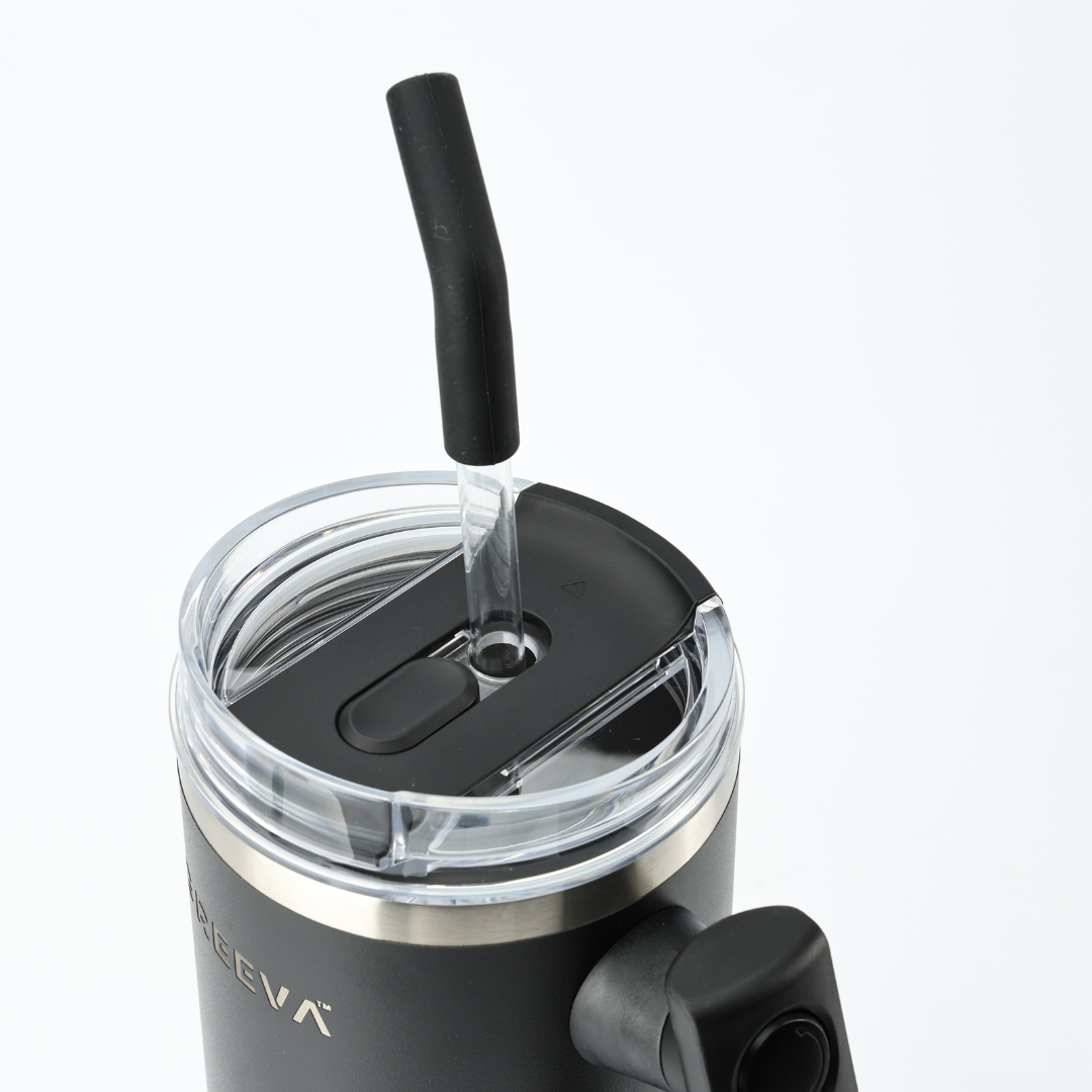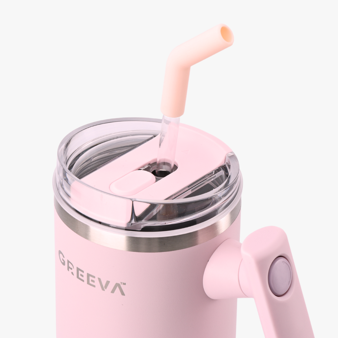 Tired of leaky cups, noisy open straws full of bacteria, and flimsy handles that hurt your wrist? The Greeva FlipBottle™ was designed to give you relief with its hygienic, silent straw, leak-proof locking lid, 180° rotating handle, and easy cleaning.